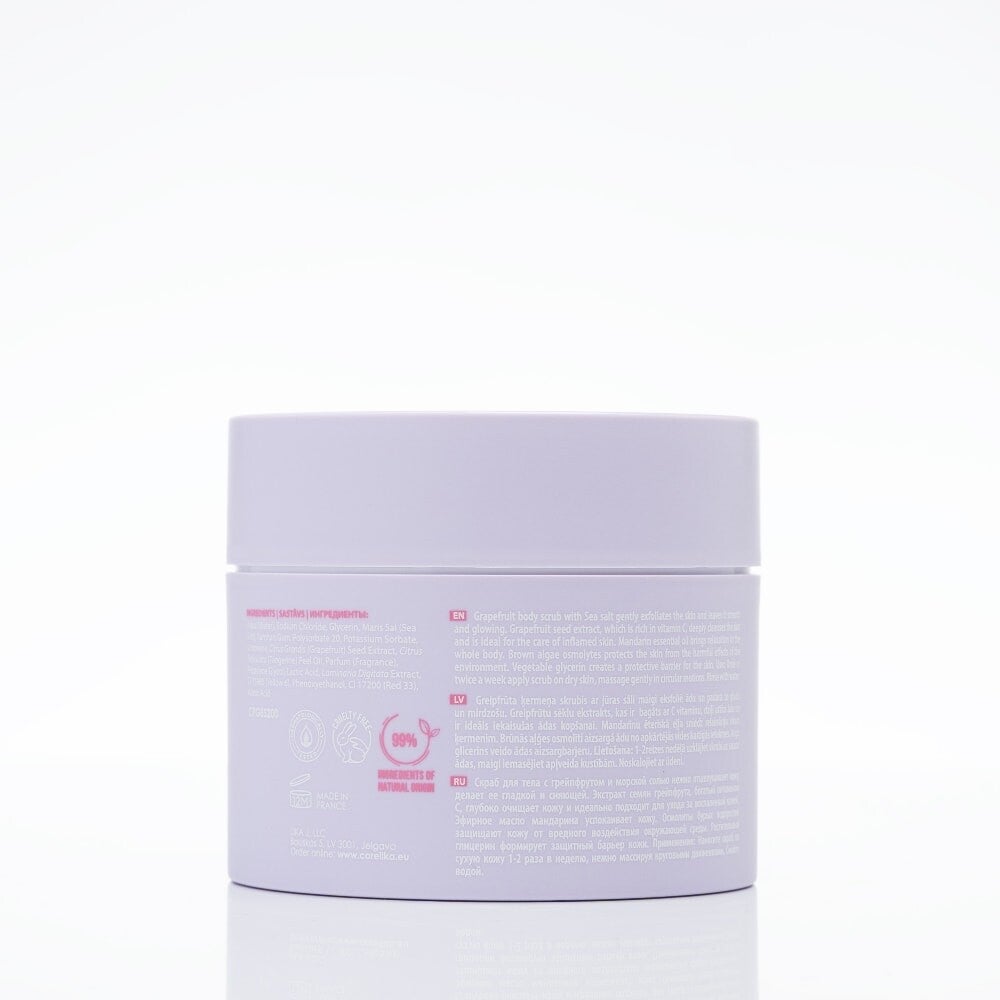 Deze excotische body scrub is een overvloed aan citrusvruchten die je een verfrissend en verkwikkend gevoel geeft. Deze scrub zit boordevol grapefruitzaadextract en scrubt je lichaam zachtjes om dode cellen en een gebruinde laag die de huid dof maakt te verwijderen. De frisse citrusgeur geeft je energie en verbetert je humeur. Het grapefruitzaadextract zit boordevol vitamine C, verwijdert puistjes en pigmentvlekken en reinigt zachtjes de verstopte poriën, zodat je huid gemakkelijk ademt en je een verfrissend gevoel krijgt. De zeezouten helpen onzuiverheden te verwijderen, terwijl het zeewier osmolyte de hydratatiebalans in elke cel herstelt door waterverlies te voorkomen. Het hydrateert grondig en geeft energie voor een zacht, soepel gevoel en een glanzende teint. Verrijkt met mandarijnolie en plantaardige glycerine beschermt de scrub de huid tegen uitdroging en verbetert het natuurlijke vochtgehalte in het lichaam.